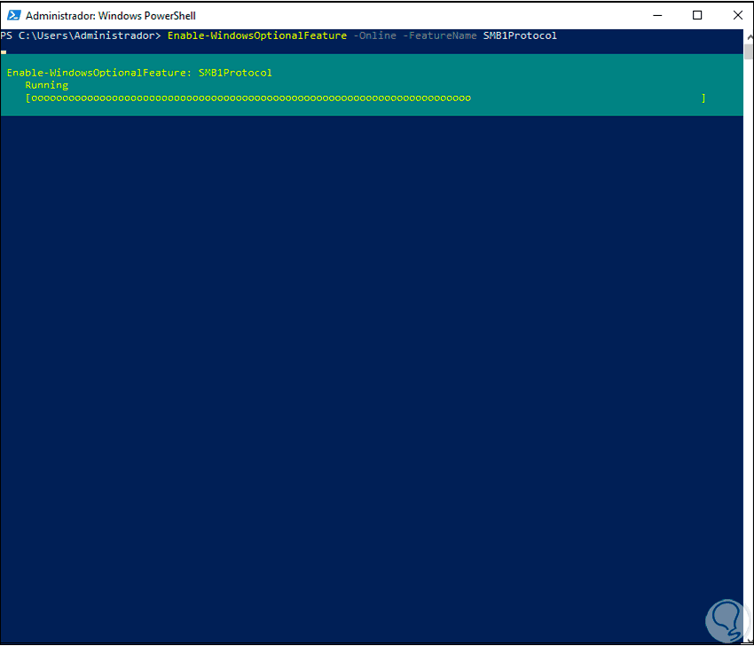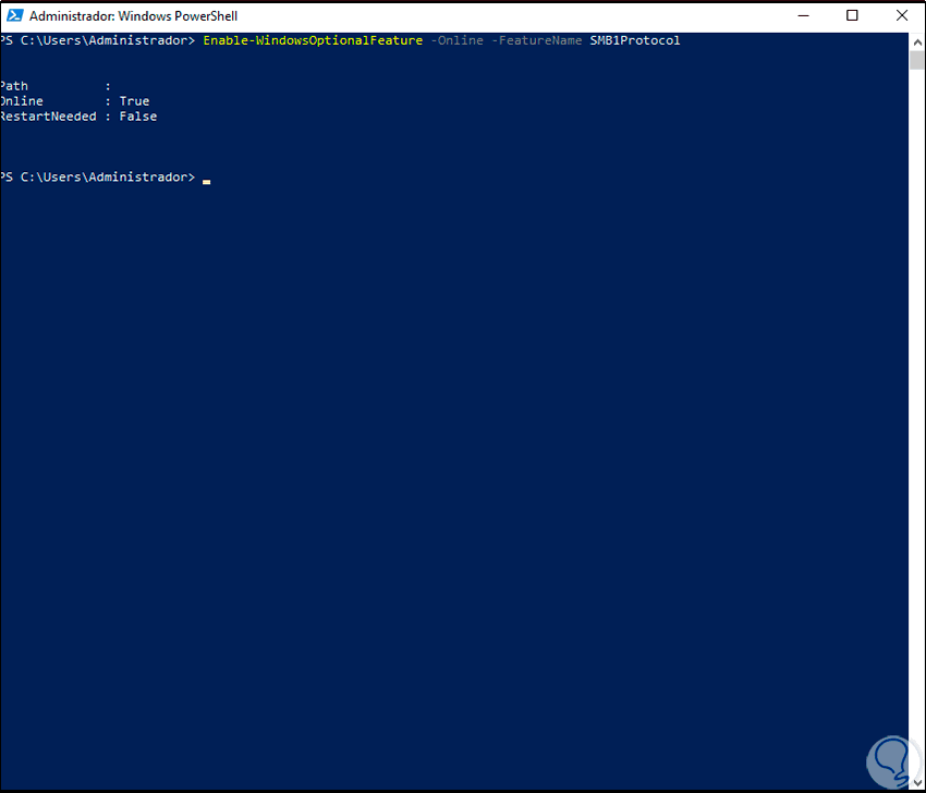 Finalmente podemos recurrir de nuevo a PowerShell, abrimos PowerShell como administradores y para activar SMB1 ejecutamos: