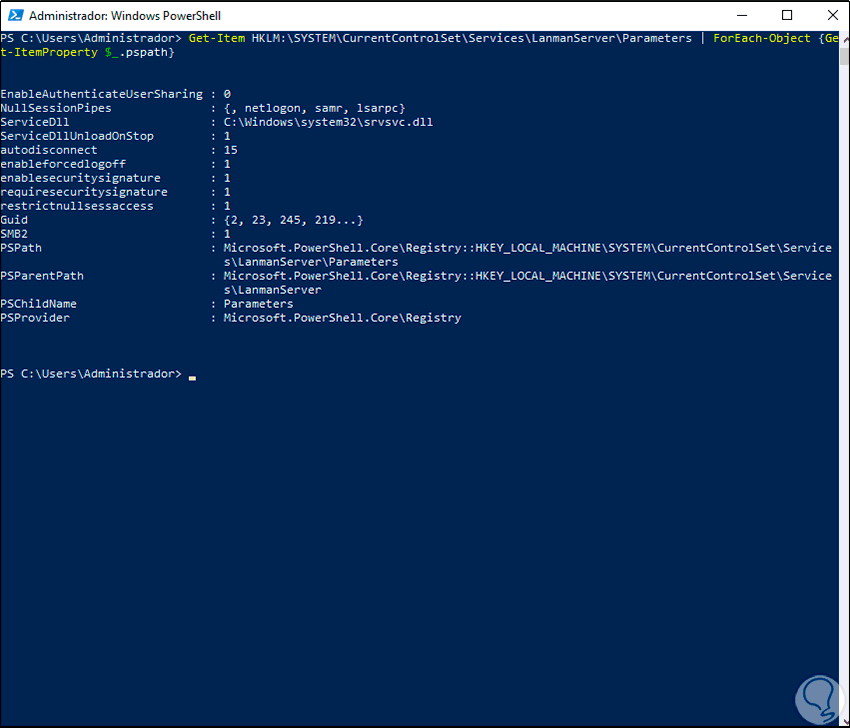 Get-Item HKLM:\SYSTEM\CurrentControlSet\Services\LanmanServer\Parameters | ForEach-Object {Get-ItemProperty $_.pspath}