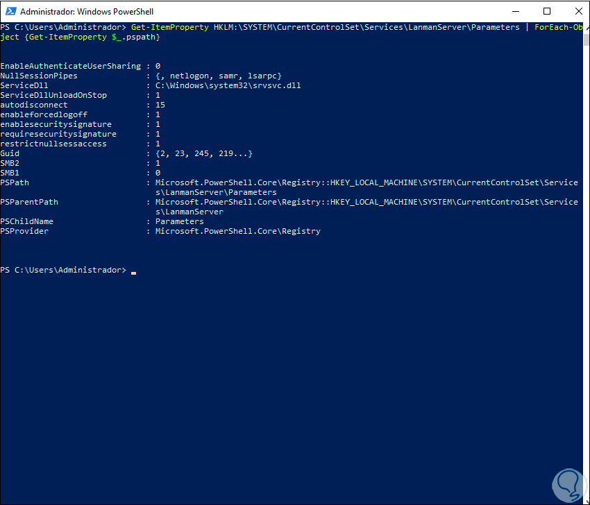 En esta misma consola de PowerShell vamos a detectar el servidor SMB1: