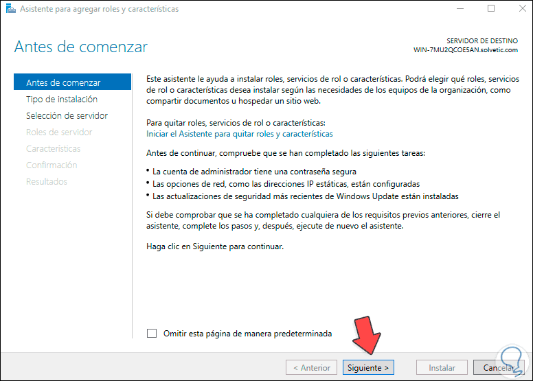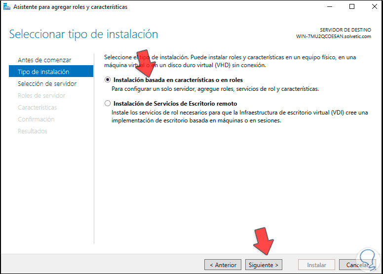 Clic en Siguiente y activamos la casilla "Instalación basada en roles o en características":