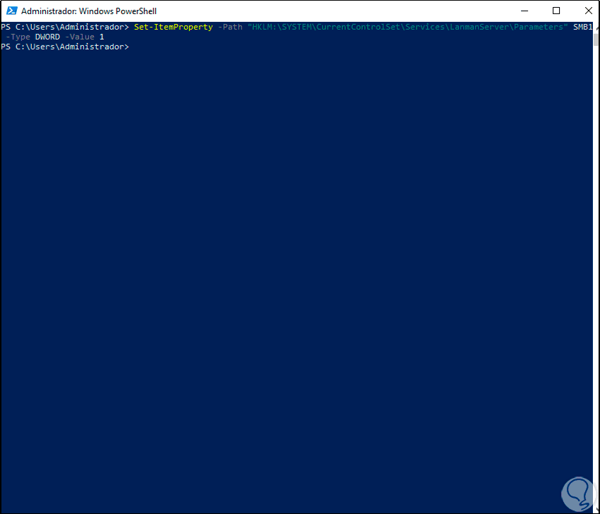 Este comando nos da detalles completos sobre el servidor SMB1, para habilitarlo desde acá, el servidor SMB1, ejecutamos: