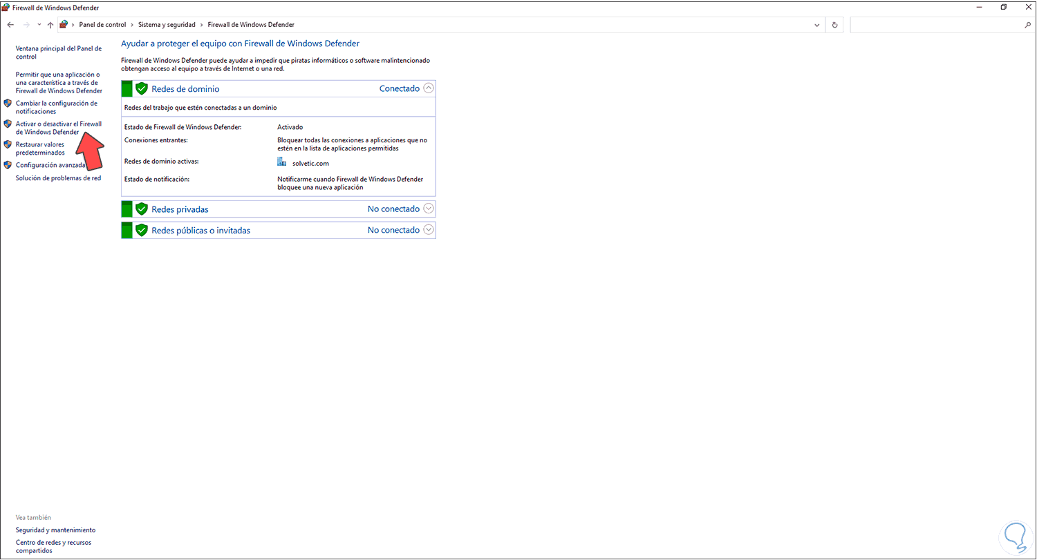 Damos clic en “Activar o desactivar el Firewall de Windows Defender”, veremos esto: