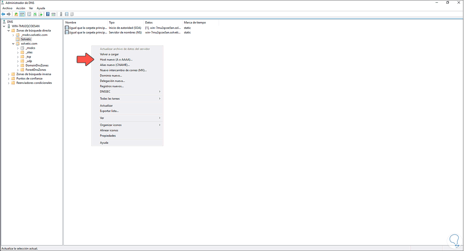 En la nueva zona clic derecho y elegimos "Host nuevo (A o AAAA)":