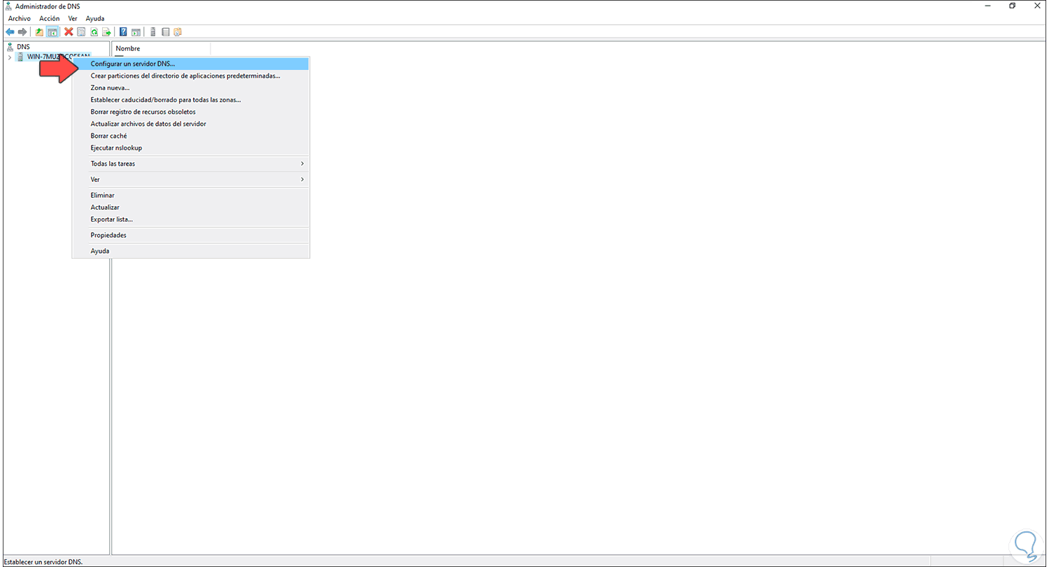 Damos clic derecho sobre el servidor y seleccionamos "Configurar un servidor DNS":