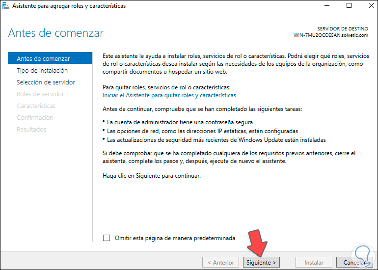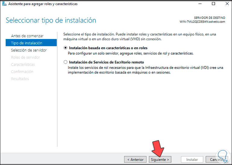 Clic en Siguiente y ahora activamos la casilla "Instalación basada en características o en roles":