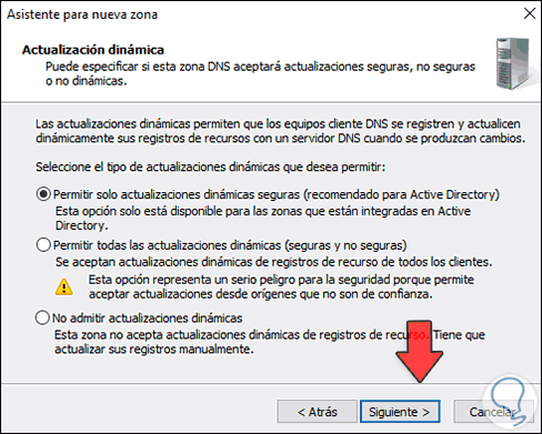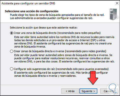 Allí podemos seleccionar el tipo de configuración a usar, para este caso activamos la casilla "Crear una zona de búsqueda directa" y damos clic en Siguiente, luego veremos esto: