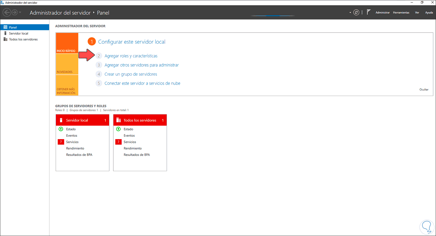 Vamos al Administrador del servidor y allí damos clic en "Agregar características y roles":