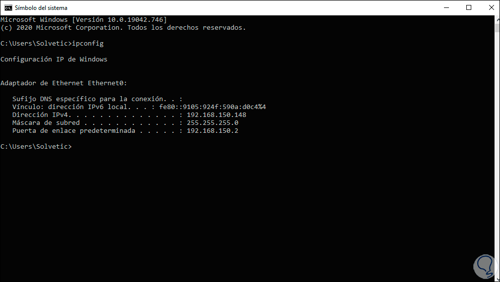 Accedemos al CMD y ejecutamos "ipconfig" para ver la IP local: