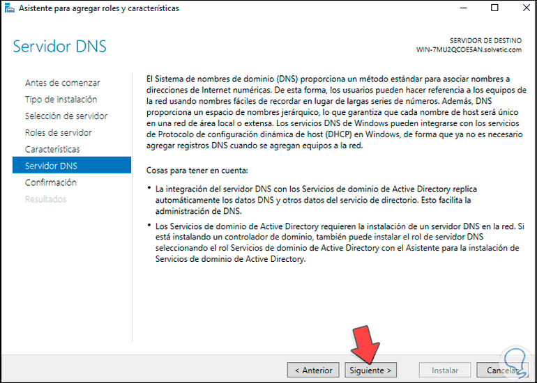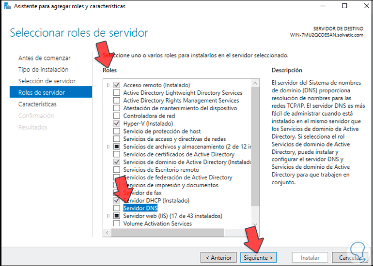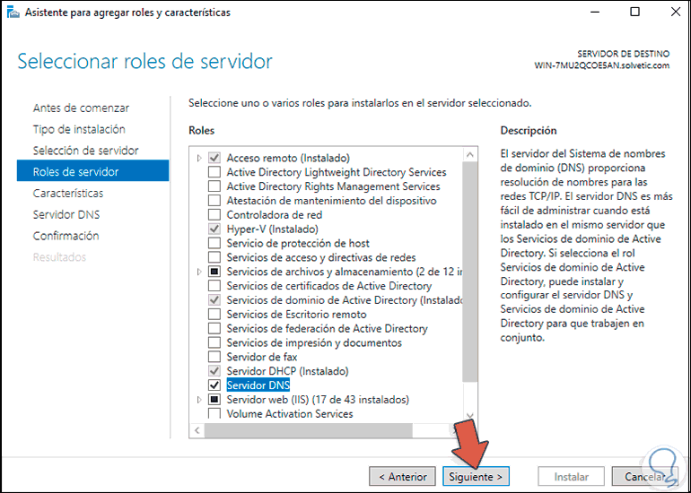 En la sección de roles seleccionamos el rol "Servidor DNS":