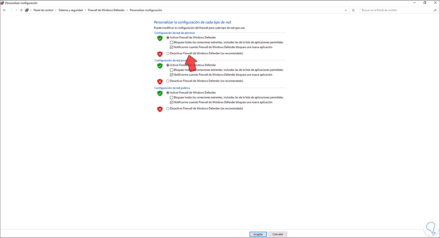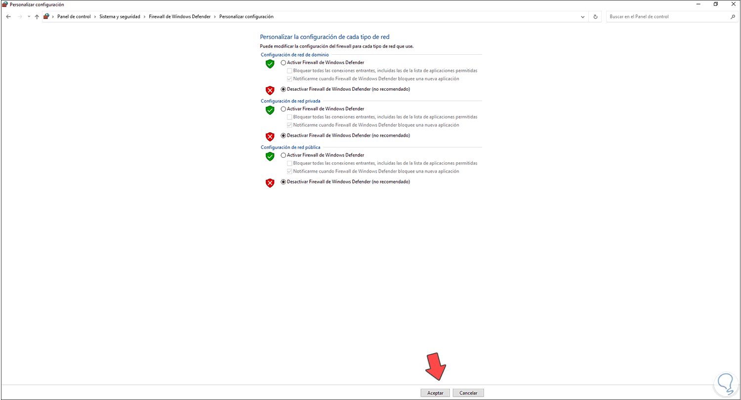 Luego desactivamos el firewall activando las casilla “Desactivar Firewall de Windows Defender. Aplica los cambios.