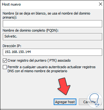 En la ventana desplegada ingresamos la IP del servidor y activamos la casilla "Crear registro del puntero (PTR) asociado". Damos clic en “Agregar host” para aplicar los cambios.