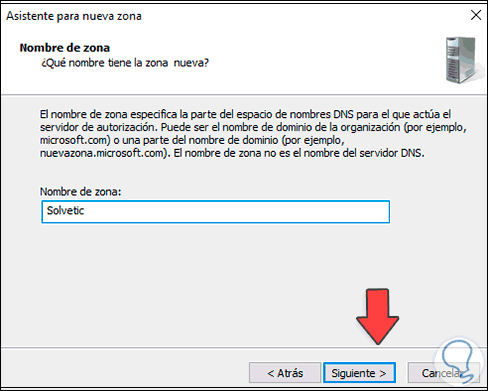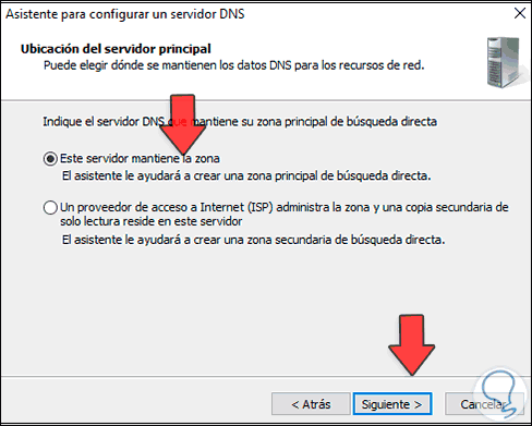 Allí podemos definir si es el servidor local o un proveedor de Internet ISP el que administra la zona, dejamos la opción por defecto y damos clic en Siguiente para asignar el nombre de la zona: