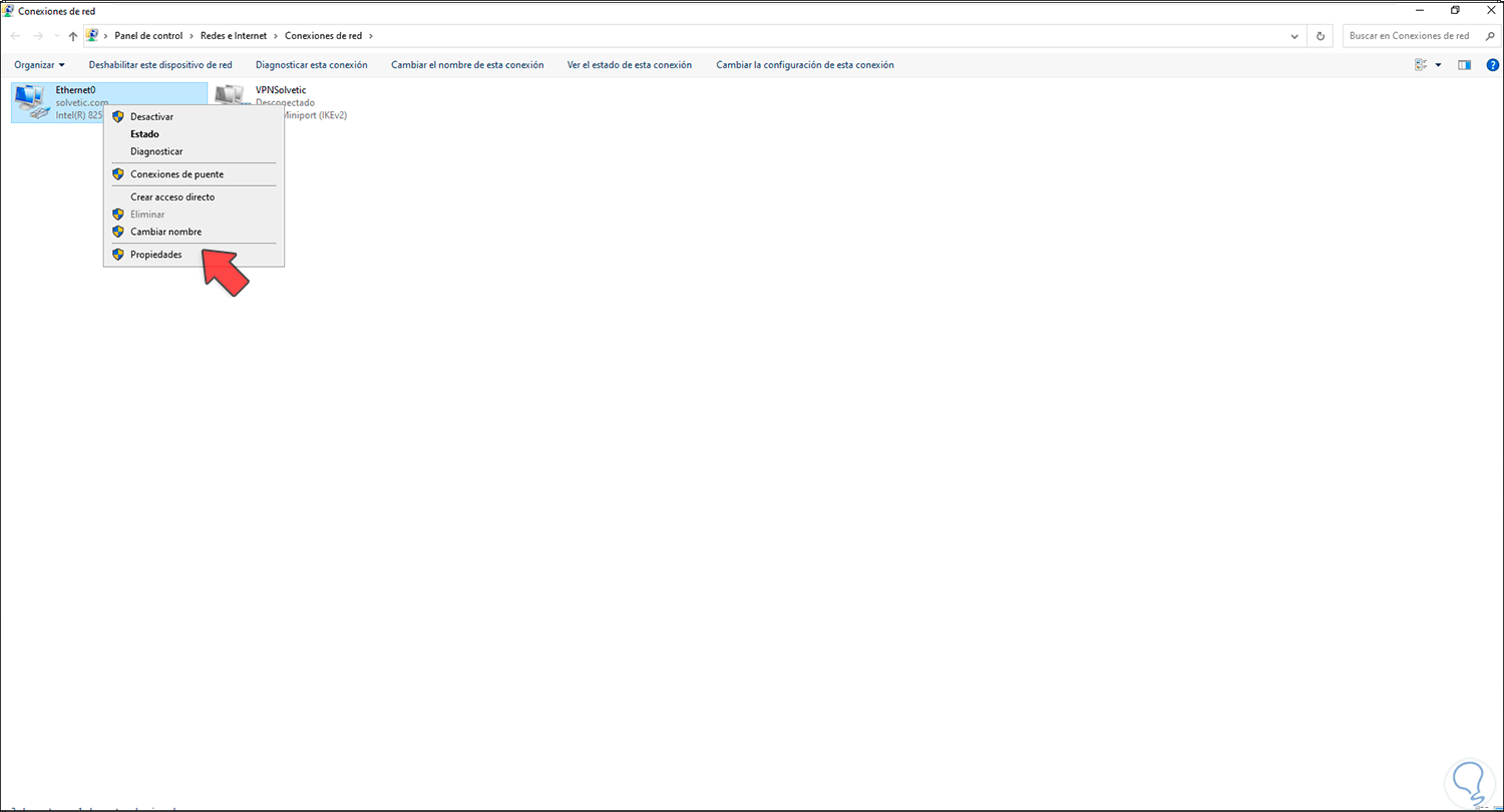 Damos clic en "Cambiar la configuración del adaptador" y en la siguiente ventana damos clic derecho sobre el adaptador y seleccionamos "Propiedades":