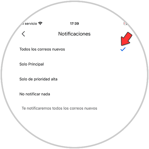 Finalmente selecciona que quieras activar todas las notificaciones de "Todos los correos nuevos"