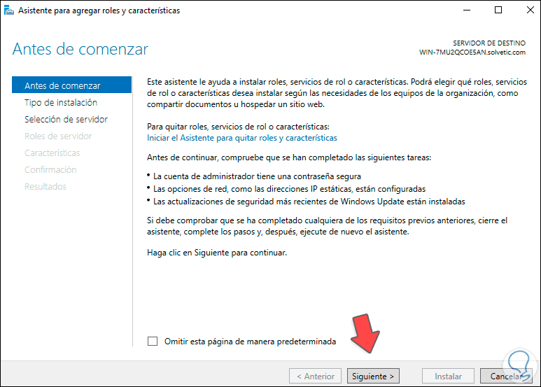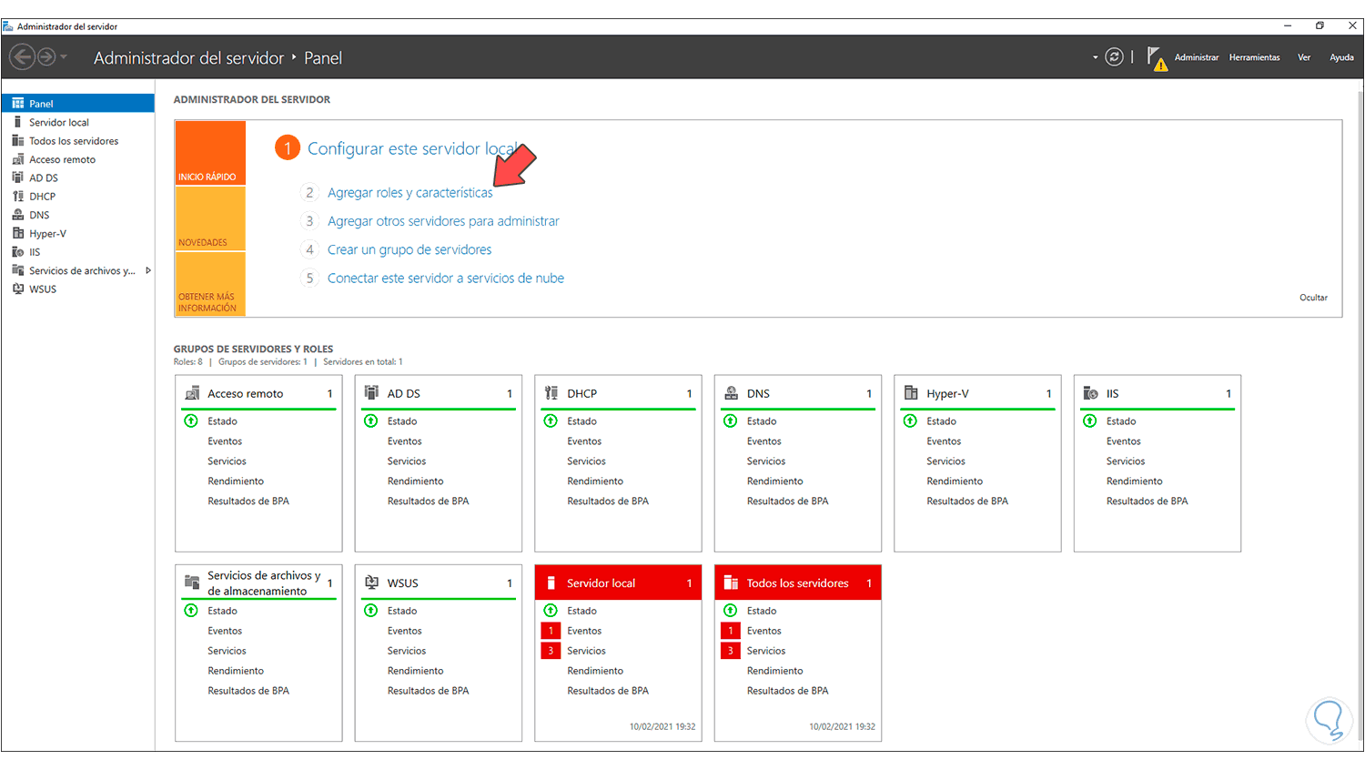 Ahora vamos al Administrador del servidor y allí damos clic en "Agregar roles y características":