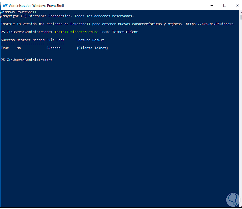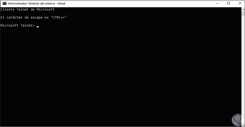 Después de esto vamos de nuevo a la consola del símbolo del sistema y ejecutamos ”telnet”, veremos lo siguiente: