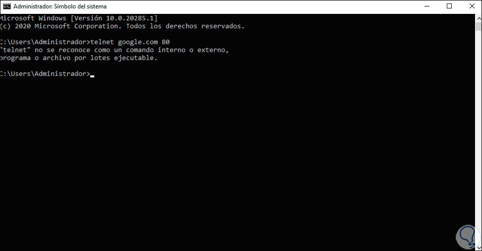 Podemos ver que Telnet no se reconoce como un comando en el servidor.