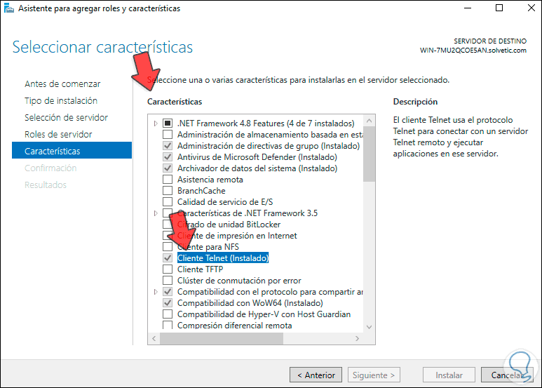 Vamos hasta la sección "Características" y allí validamos que la casilla "Cliente Telnet" esté activa, si no es así actívala y completa el proceso: