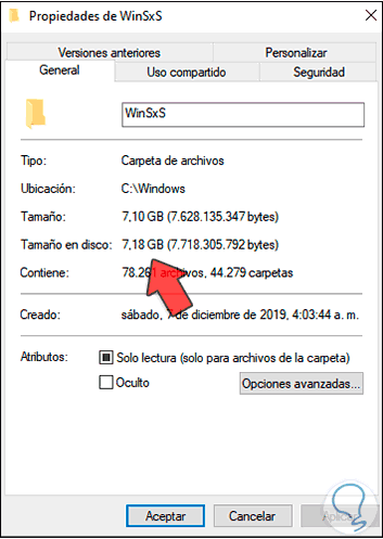 Ahora podemos comprobar las propiedades de la carpeta WINSXS para ver su tamaño actual. Tuvimos una reducción y esto depende de cada sistema.
