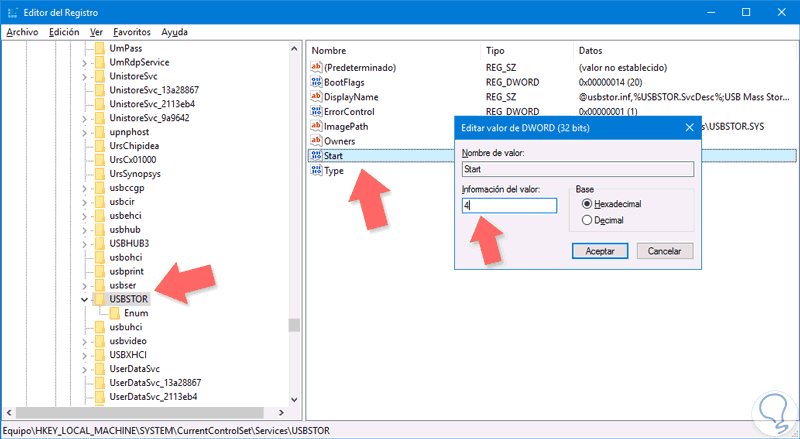 Ahora debes llegar a la siguiente ruta dentro del editor de registro, busca el dato Start y se debe cambiar su valor a un 4.