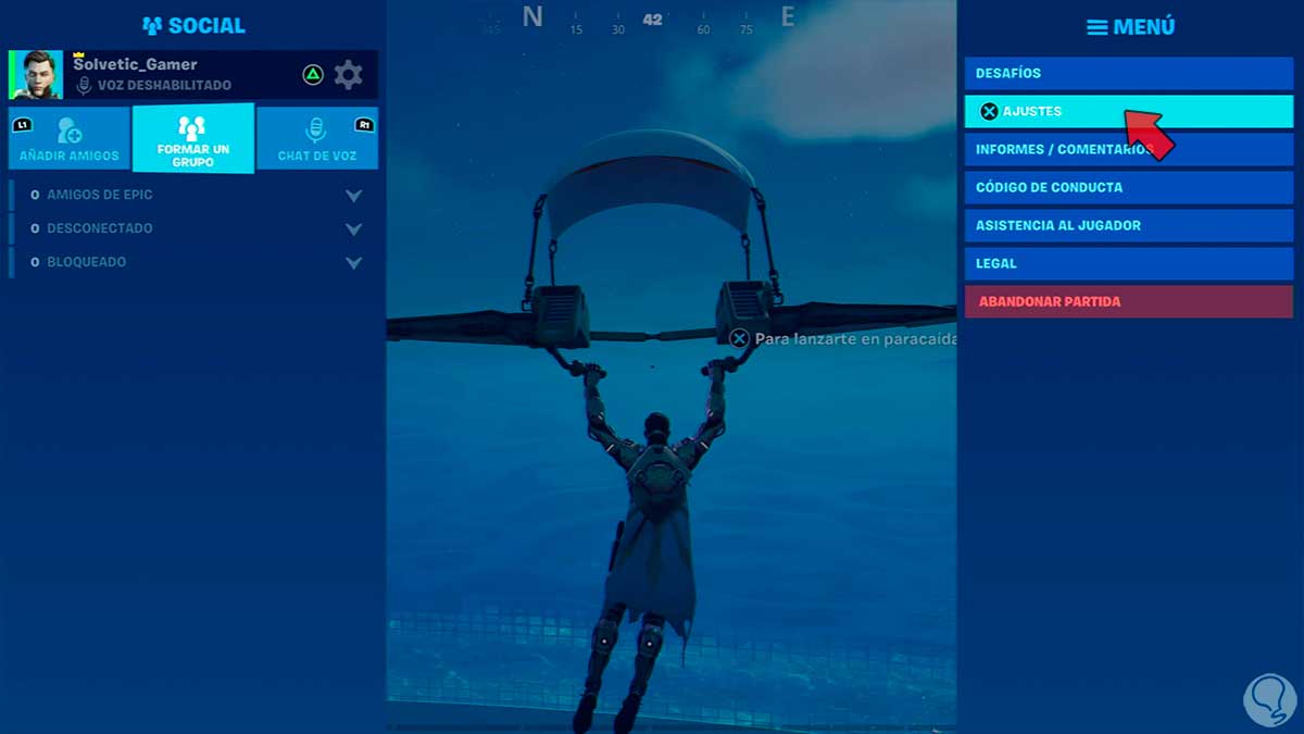 Primero pulsamos en el botón “Opciones” del mando. Ahora entramos "Ajustes" dentro de Fortnite.