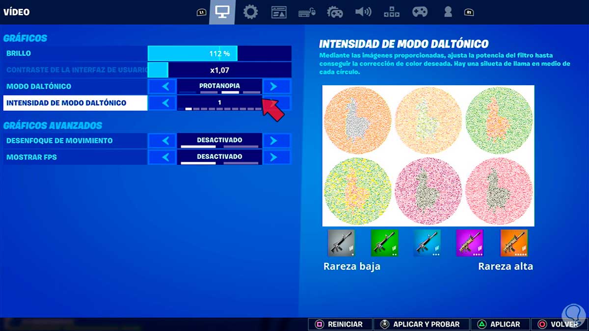 Vamos variando cada opción y volvemos al juego para probar cada uno y ver el resultado en Fortnite.