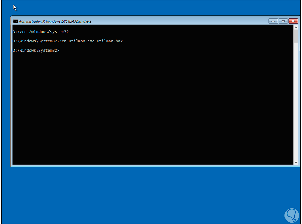 Ahora ejecuta "cd /windows/system32", allí vamos a renombrar Utilman con el siguiente comando: