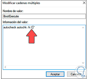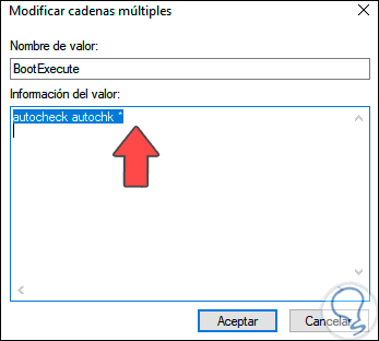 En el panel central ubicaremos el valor llamado "BootExecute", damos doble clic sobre él y será desplegada la siguiente ventana: