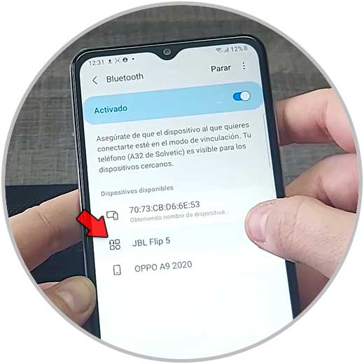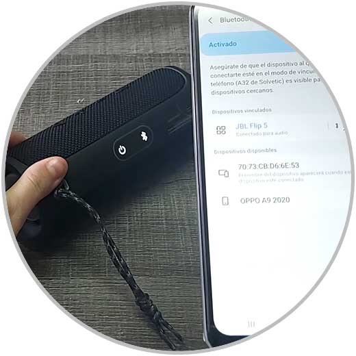 Ahora lo debes activar y que busque dispositivos. Tendrá que encontrar el altavoz JBL Flip 5.