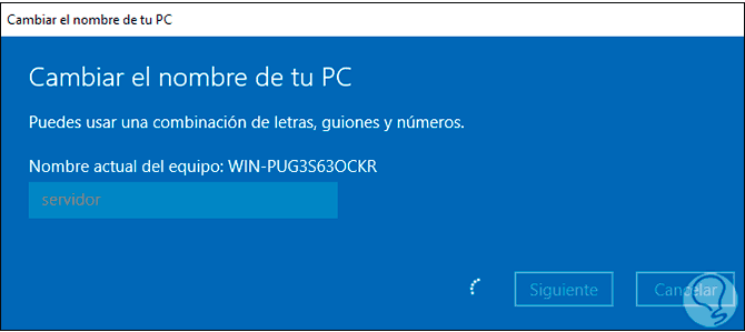 El nuevo nombre no debe contener espacios o caracteres especiales, damos clic en Siguiente para que se inicie el proceso de cambio de nombre: