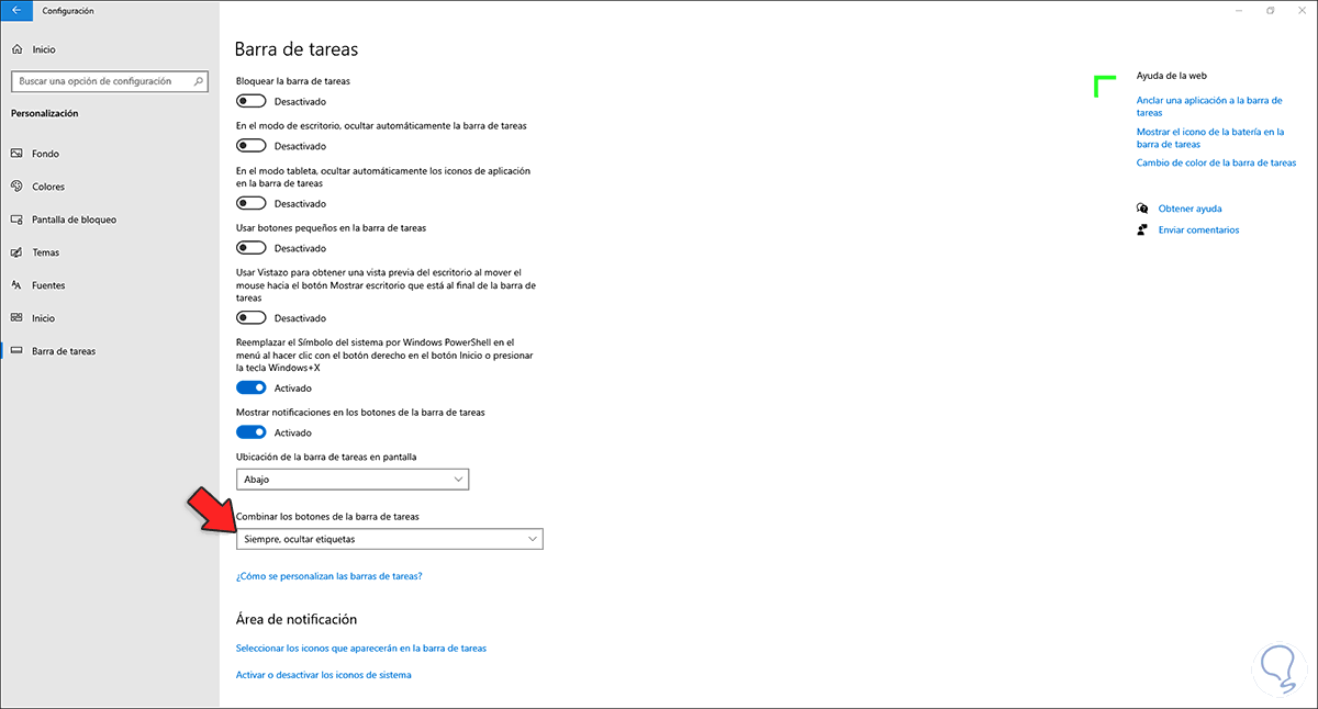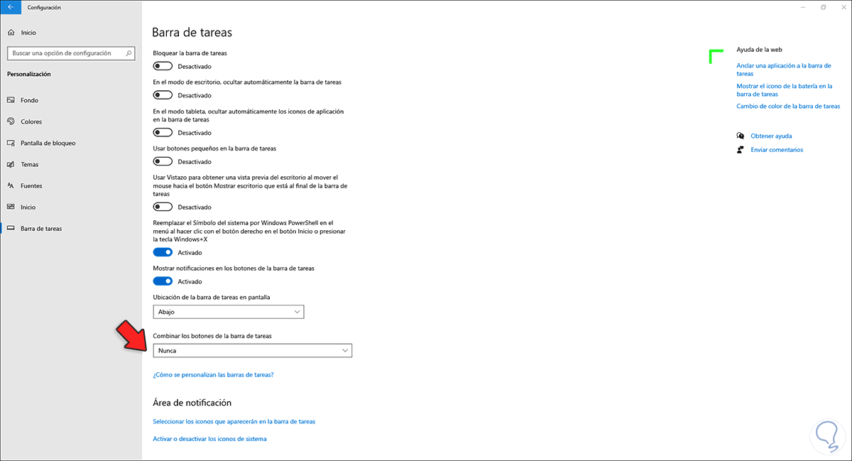En el campo "Combinar los botones de la barra de tareas" vemos el valor por defecto “Siempre, ocultar etiquetas”, lo establecemos en "Nunca":