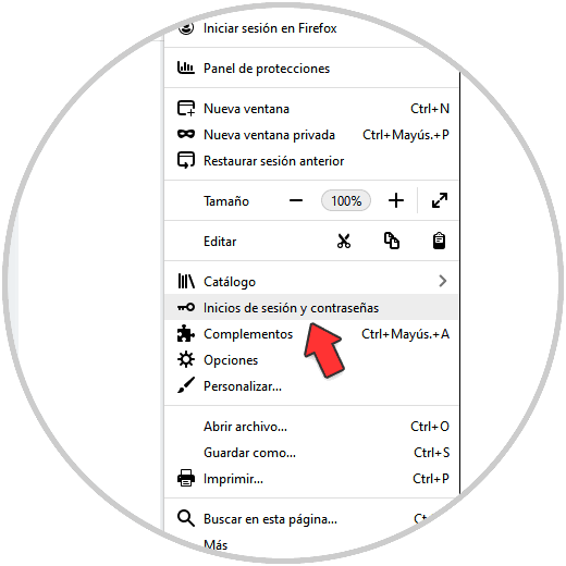 Abrimos Firefox, allí pulsamos en el menú y seleccionamos "Inicios de sesión y contraseñas":