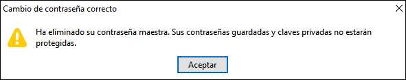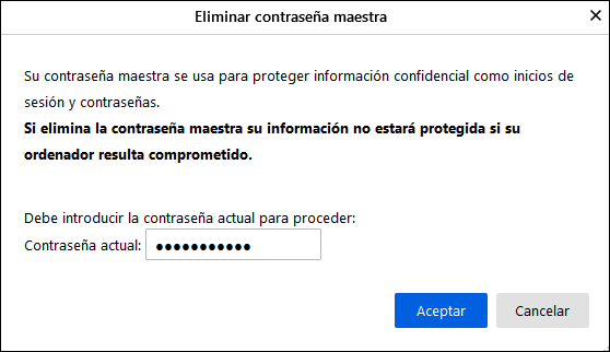 Para eliminarla, desactivamos la casilla "Usar una contraseña maestra", veremos esto: