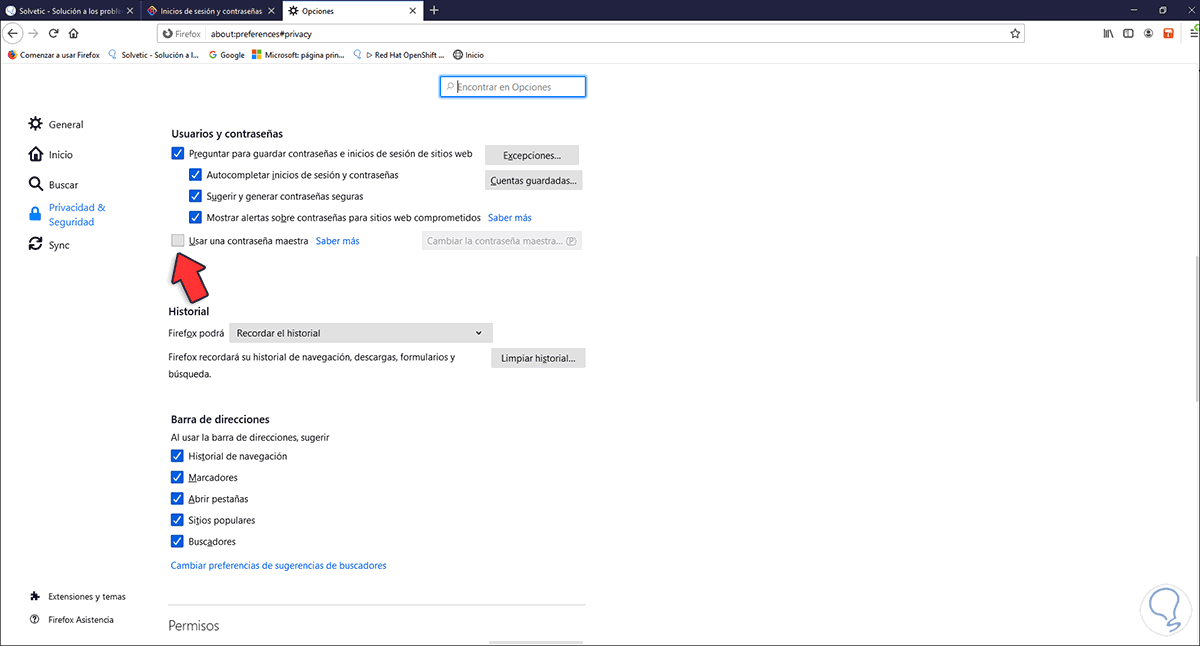 Sin embargo esto puede ser un arma de doble filo ya que al estar guardadas con inicio automático una persona no autorizada que tenga acceso al equipo podrá abrir estos sitios. Es por ello que Firefox ha integrado una medida extra de seguridad llamada contraseña maestra.