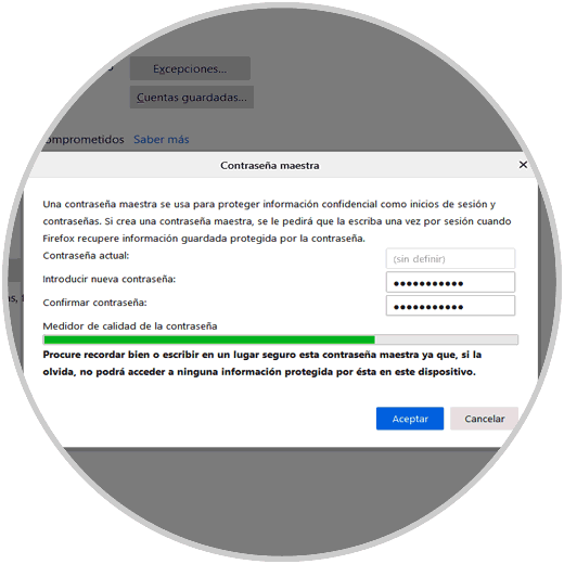 Clic en Aceptar y la contraseña maestra estará habilitada.