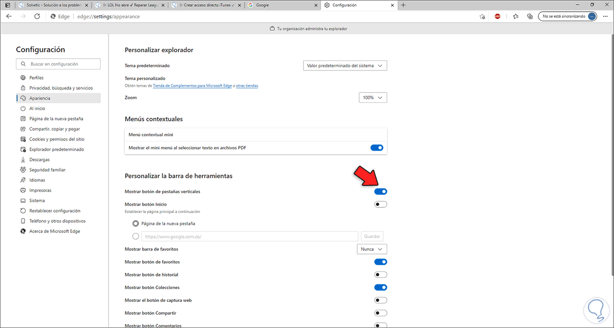 En la sección "Apariencia" validamos que "Mostrar botón de pestañas verticales" esté habilitado: