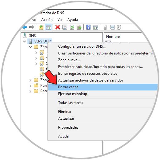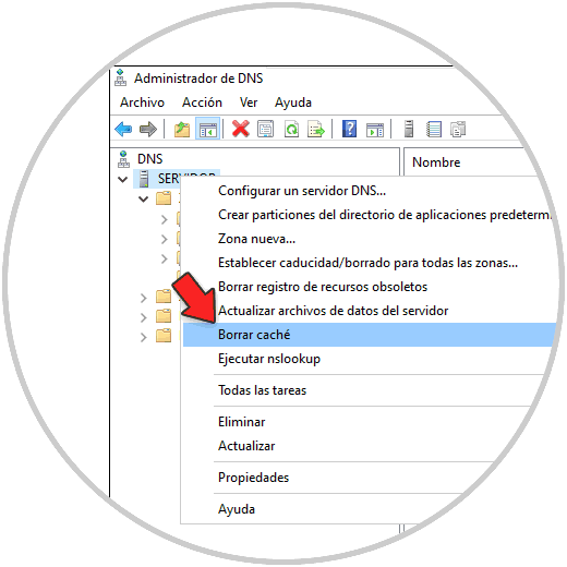 Ahora vamos a vaciar la cache para que el proceso se actualice, para ello damos clic derecho sobre el servidor y seleccionamos la opción "Borrar caché":