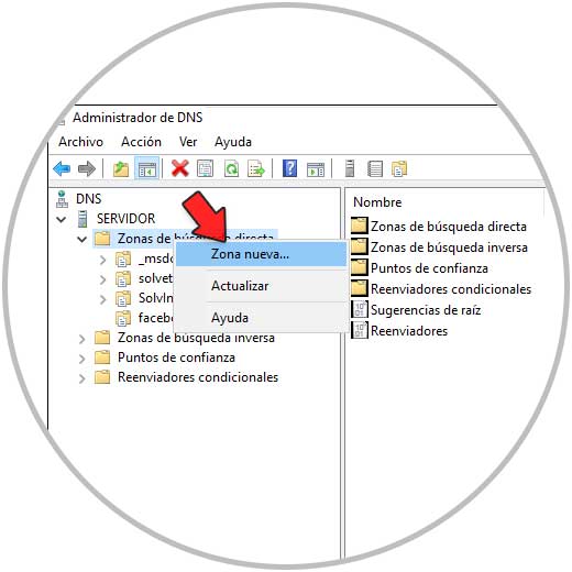 Probemos ahora Instagram, vamos a la consola del DNS , damos clic derecho en "Zonas de búsqueda directa" y seleccionamos "Zona nueva":