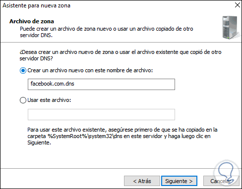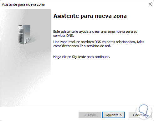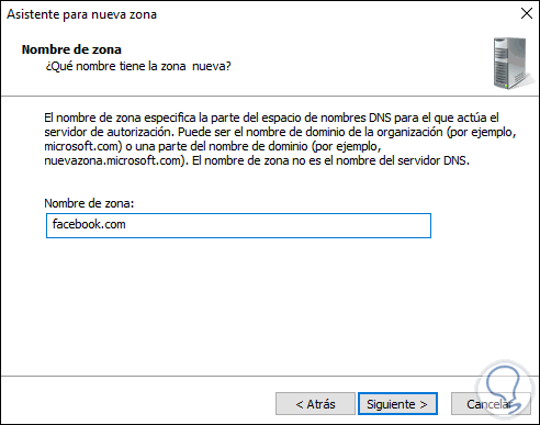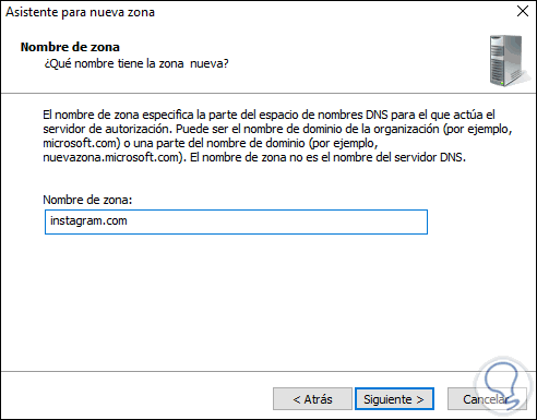 Damos clic en Siguiente e ingresamos el nombre de la zona el cual será el nombre de la pagina web (para una mejor administración):
