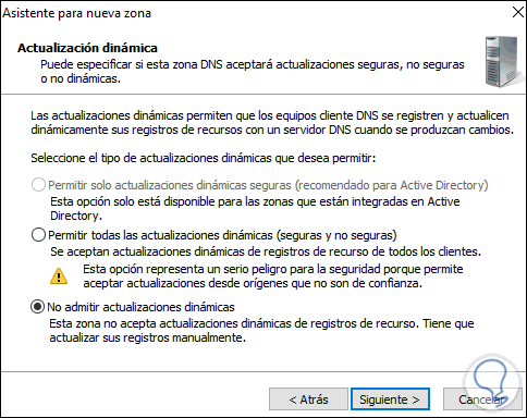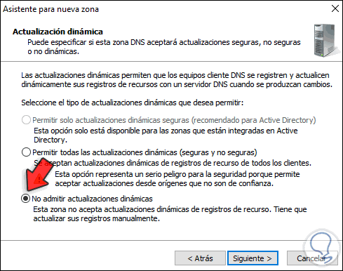 En la siguiente ventana activamos la casilla “No admitir actualizaciones dinámicas”: