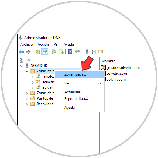En la consola de DNS damos clic derecho en "Zonas de búsqueda directa" y allí seleccionamos "Zona nueva":