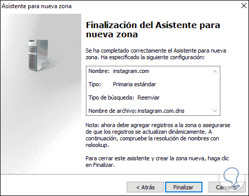 Clic en Siguiente para ver el resumen de la zona. Damos clic en Finalizar para completar el proceso.