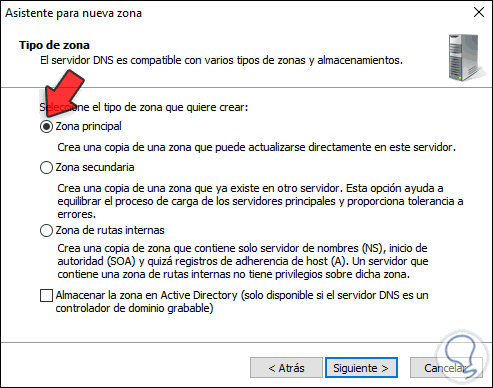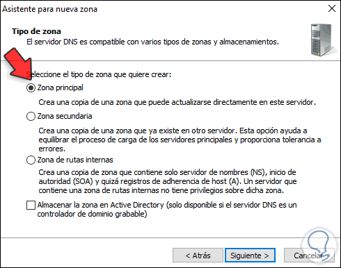 Damos clic en Siguiente y allí seleccionamos "Zona principal" y desactivamos la casilla "Almacenar la zona en Active Directory":