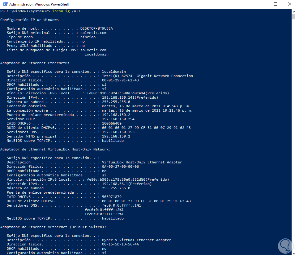 Ya sea en el servidor o en los equipos cliente ejecutamos “ipconfig /all” en CMD o PowerShell para ver la IP (del servidor) la cual actúa como DNS: