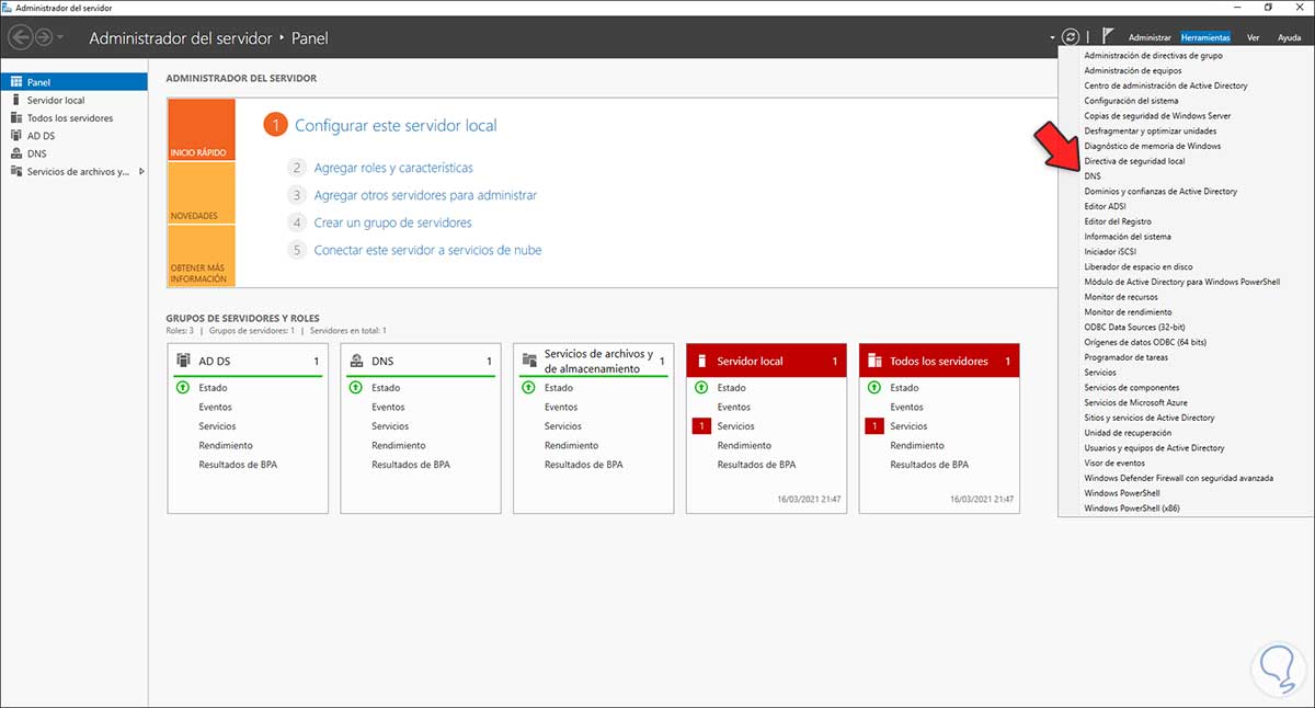 En el Administrador del servidor vamos a "Herramientas - DNS":