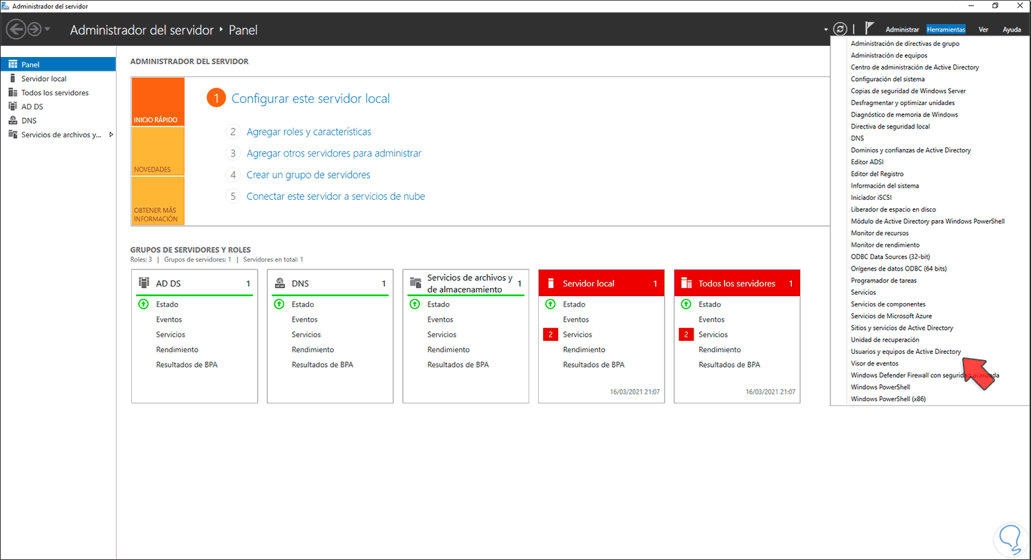 Vamos a "Herramientas - Usuarios y equipos de Active Directory":