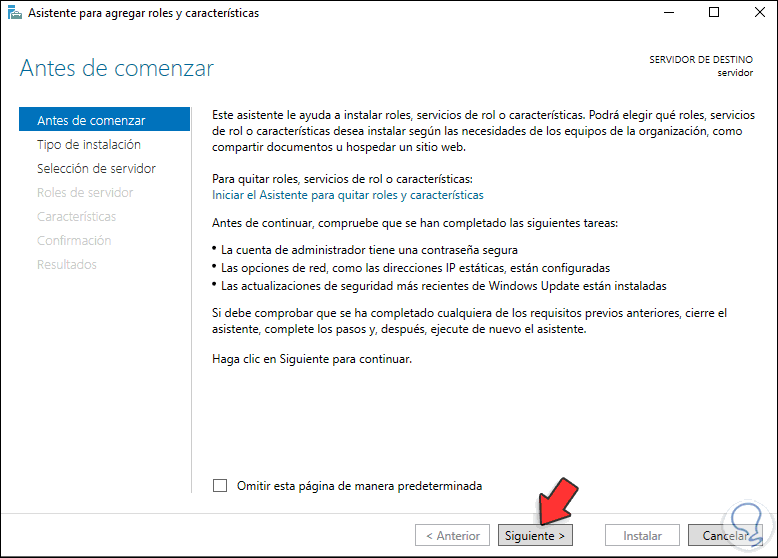 Damos clic en "Agregar roles y características", se desplegará el siguiente asistente: