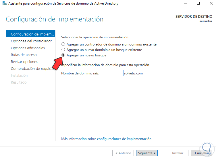 Se desplegará el siguiente asistente, allí activamos la casilla "Agregar un nuevo bosque" e ingresamos el nombre del dominio: