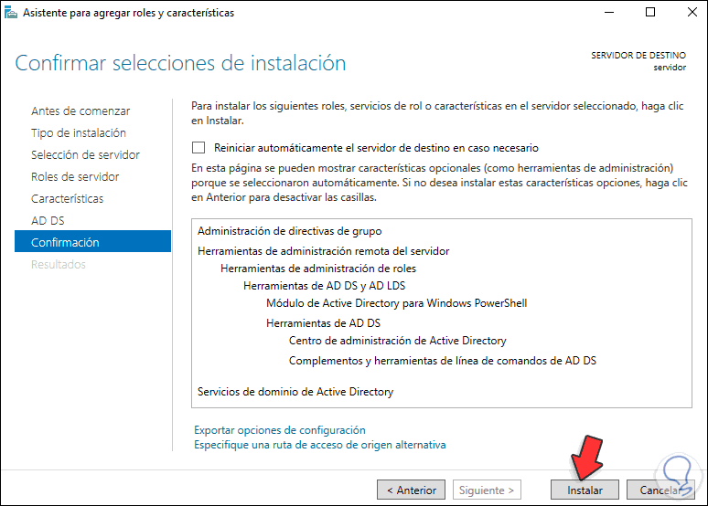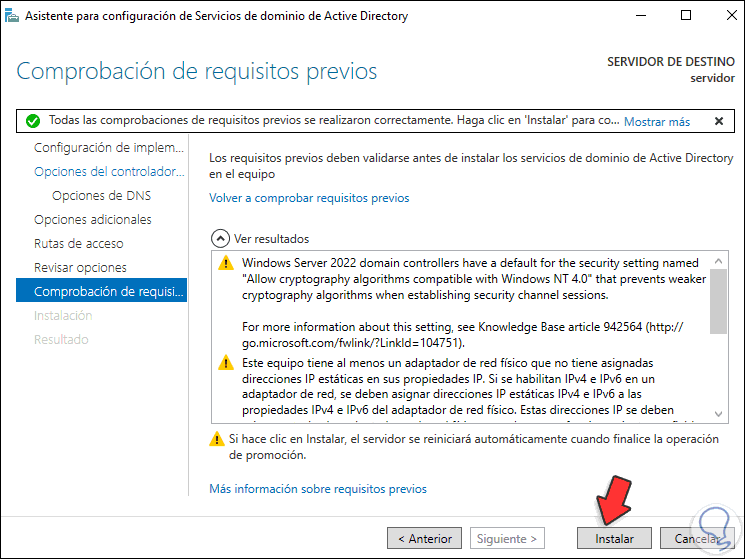 Clic en "Instalar" para iniciar el proceso de promoción de Windows Server 2022 a controlador de dominio: