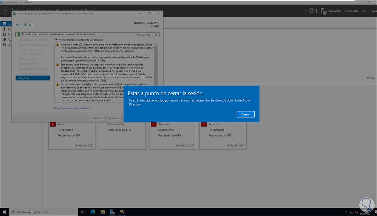 Clic en Cerrar y reiniciamos Windows Server 2022: